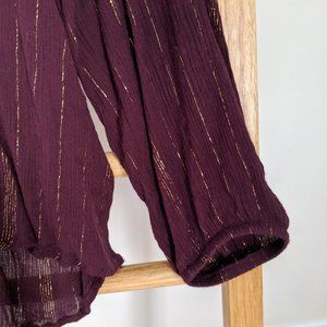 Beautiful maroon and gold boho long sleeve top by Rock and Republic. Shirt has cinched sleeve ends and embellishments along the v-neck cut neckline.