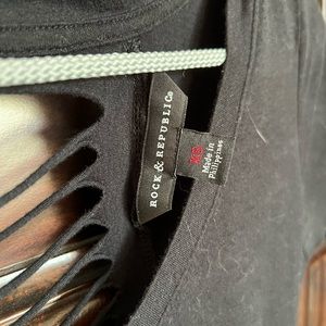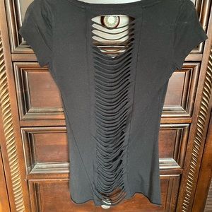 Good Used condition. Size XS. Black. Ripped back. Rhinestone snake studded. Short sleeve tee.