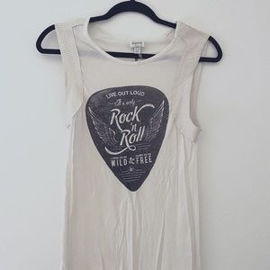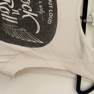 Rock and roll screen print, purchased from a boutique shop in Vancouver, white faux leather sleeve detail, slight cracking in faux leather at top of shoulder, size XS, stretchy cotton blend, super cute with jeans and boots or with a funky skirt and heels and jacket.