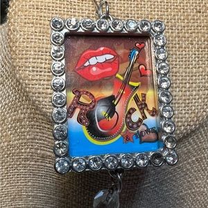 What a funky cool pendant! The front has a great colorful classic rock design with a profound quote on the flip side: silver color and rhinestones.