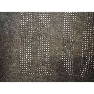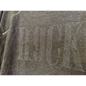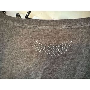 Plus size 2xl (torrid 0,1,2) rock & republic free spirit rock crystal/rhinestone studded bling sweatshirt w/ top arm zipper accents(zippers do work giving the shirt a versatile way to wear) angel wings r & r logo on back -dark gray & metallic silver bling crewneck pullover sweatshirt/top/blouse shirt with a distressed: worn