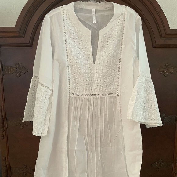New and never worn. 100% cotton. Size L. Just below the knee in length. Beautiful detail on the sleeves and neck/chest area. 3/4 sleeve