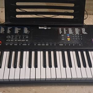 RockJam RJ361 electronic keyboard with digital display. Features multiple function buttons and a music stand. Sleek black design.
