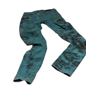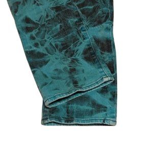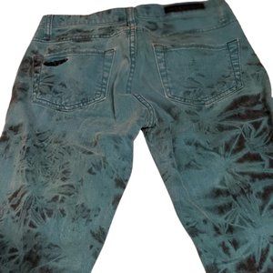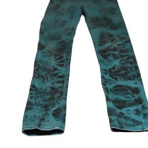 these striking jeans feature a vibrant teal and black tie-dye pattern suggesting a festival style