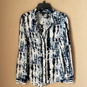 Rock & Republic Long Sleeve Tie Dye Button Down Blue & White Front pocket 100% rayon Excellent Condition Size Med
