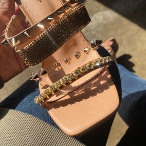 Trendy Rose Gold RockStud and Rhinestone straps featuring the highly desired Square Toe. these Heels are gorgeous for a night out, sparkly and shine steal the night ✨true to size for most. 4 strap mules