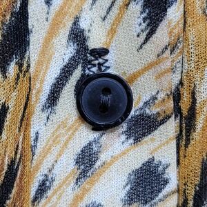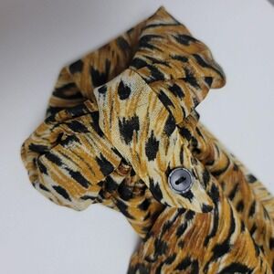 A cute mid-century half-placket retro cheetah print blouse with sweet gathered shoulder detail and roll-tab sleeves.