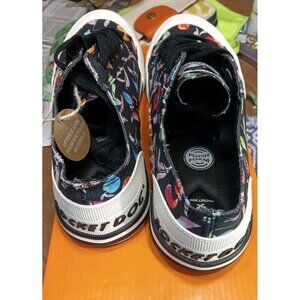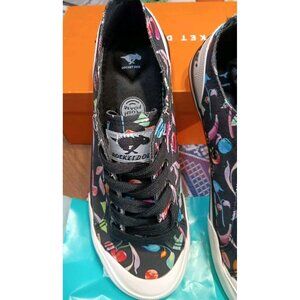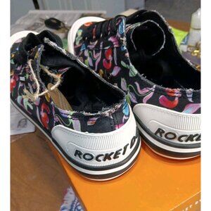 These Rocket Dog sneakers are women's athletic shoes in a size 8.5 with a lace-up closure. They feature a black color with a multi-colored pattern, and are made from recycled cotton material. The shoes have a colorful and playful design, suitable for walking and school activities in the summer, fall, and spring seasons.