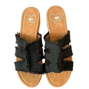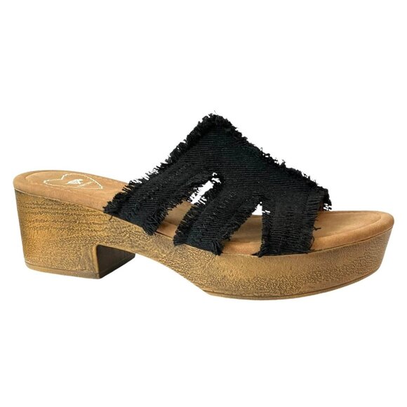 Rocket Dog Clipper Slip On Black Frayed Denim WOOD Platform Block Heel COMFORT Memory Foam Sandal Sz 9