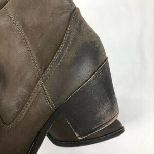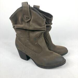 Rocket Dog weathered leather look slouchy cowboy style ankle boots with heel. Light colored areas on the backs of heels, some worn/darkened spots, and one small spot on back of left boot (see all photos for condition). Size 8.5. Heel height 2.5"