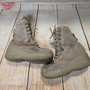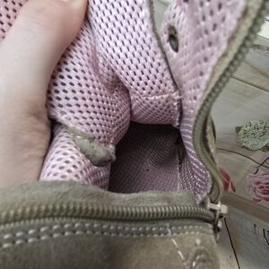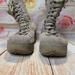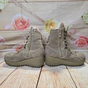 Color: tan boots. laces up the front and also zips up the side. zipper is a dog bone. some serious Y2K baddie vibes. exterior in great shape, inside the left boot there is a small collapsed section, sits right about the ball of the big toe.