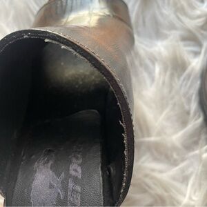 Good preowned condition. Minor wear. Hard to see any on soles. Zoom in pix for details. Vegan faux leather upper has intentional creases and multi brown and black coloring. Looks vintage like. Heel is medium weight foam type. Super light and comfy shoe. Black heel wedge block with suede type insole material. Feels comfy like their flip flop sandals. Super cute Y2K style.