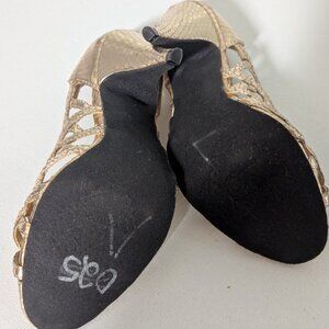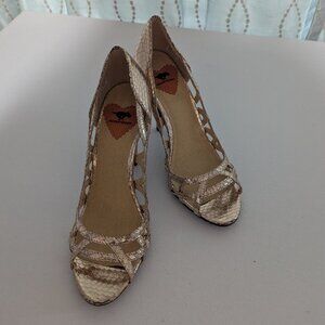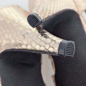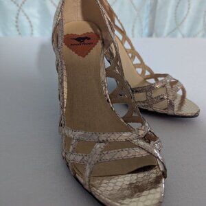 Snake skin patterned gold open toes heels. Classic iconic statement shoes stunning