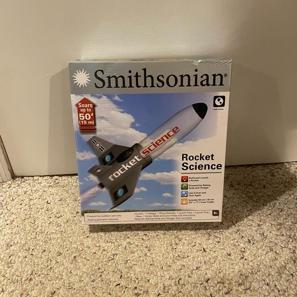 Build and launch a model rocket, powered by baking soda and vinegar. The Smithsonian Rocket Science kit comes with five pieces that easily connect, forming a rocket and launch pad. Decorate your rocket with official stickers. To launch, pour baking soda in the launch tube and vinegar in the fuselage. Slide the pieces together, shake, place on the ground, stand back 10’, and wait for lift off! Your rocket can soar up to 50’! Launch it again and again! Included STEM content poster teaches about rockets and their history. Baking soda and vinegar not included. Ages 8+.