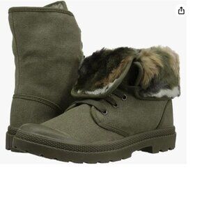 Rocket Dog Pilot Boot in olive. Feature a low block heel measuring between 3/4 to 1 1/2 inches, perfect for everyday wear. The upper fabric material offers durability and can be worn up or folded down, while the medium width accommodates a standard size foot.