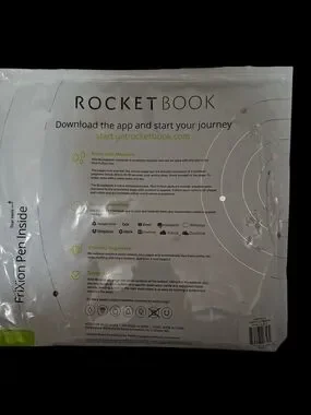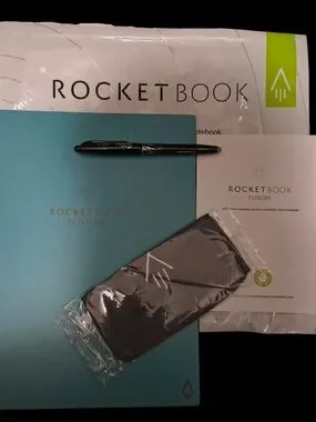 Rocketbook reusable smart notebook. Aqua Green cover with Gray Lettering. Includes Fusion technology cleaning cloth, "pen" and instructions. Wipe-clean pages for reuse. Includes lined pages with pages for To Do List and weekly planning, as well as pages for your month at a glance and note taking. Other pages have a faint graph-like appearance and are suitable for writing, graphs or drawings. Jot down your drawings, notes, calendar or anything else you like then load or send to the most popular Cloud services using their app. Wipe the page clean and use again, while keeping the information sent to the cloud until you decide to delete it from the Cloud. Package opened but never used. Resealable packaging.