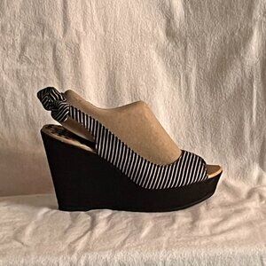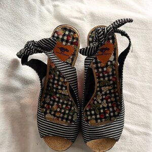 Casual and fun! These wedge sandals have a cloth upper that ties in the back for some adjustment. The wedge is covered with black denim and has a rubber sole. The part where you put your foot is cork with a checkered and fruit cloth for dramatic affect.