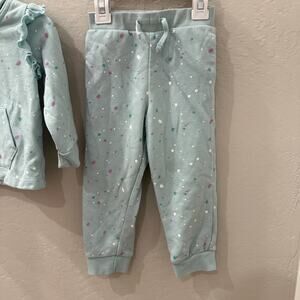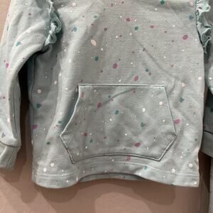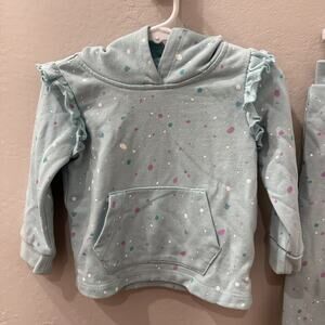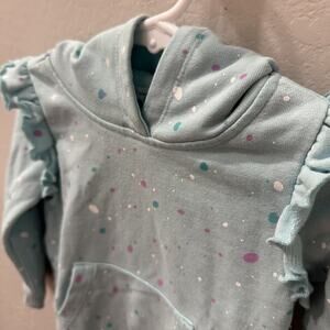 Rockets of Awesome Mini sweatsuit set size 12-18 months. Light blue background with paint splatter of purple, blue, and white. Hoodie has ruffle detail and big front pocket. Pants are jogger style with tie waist. So cute and soft! Very good condition.