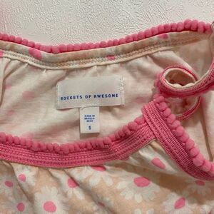 Adorable Rockets of Awesome girls’ sundress in size 5. Features a soft peach-pink base with an allover white daisy and pink dot print, spaghetti straps, and tiered skirt. Trimmed with playful pink pom-pom detailing along the neckline and straps. Lightweight and comfortable—perfect for summer, beach days, or casual outings. From a pet-friendly, smoke-free home.