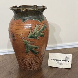 This Rock House Pottery vase was hand-carved in 1992 by Kenneth & Carolyn Poole in Seagrove, North Carolina. The vase features a glossy finish with a multicolor leaf pattern and is decorated with an engraving of a Walnut Tree, symbolizing Raleigh, NC. Measuring 9.5 inches in length and 5.5 inches in width, this numbered and signed piece is an original art pottery creation in the Folk & Indigenous style, showcasing the craftsmanship and artistry of the late 20th century. The vase comes in its original packaging, making it a unique and collectible item for pottery enthusiasts.