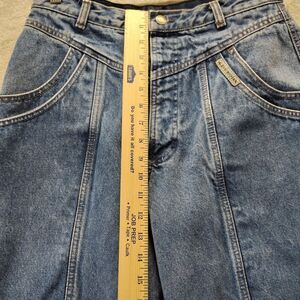 The product is a pair of vintage Rockies Jeans for women in size 33/15, featuring a high rise and blue flaps with button closure. Made of 100% cotton denim, these jeans have a regular fit and a 36-inch inseam. With a Western theme and accents like flaps, buttons, and a zipper, these jeans also have pockets and are machine washable. The brand Rockies is known for its quality and these jeans are perfect for any season, making them a versatile and stylish addition to any wardrobe.