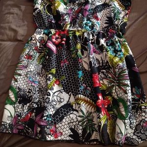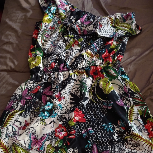 This is a super cute flowers, butterflies, & leaves print all over and a one shoulder ruffled neckline that is Soo cute and easy to dress up for a night out or down for a nice picnic. It's sized medium but in my opinion could also fit a small. It's got a stretchy waist line that would be perfect for a belt & is pretty without too! Bundle for personal discount. Free 🎁 with all purchases...