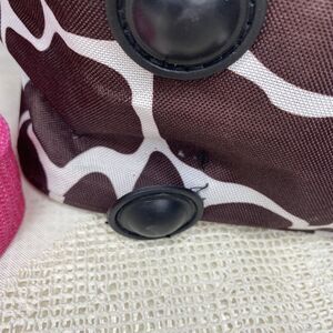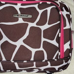 Stylish and compact, this Rockland carry-on tote features a brown cow print with bright pink accents. Measuring 13" long, 10.5" high, and 4.5" depth, its designed for easy under-seat storage. Includes dual carry handles and a removable shoulder strap for versatile travel options. Note: stitching is coming loose on one bottom bag protector, and a small snag is present on the front (see pics). Perfect for travelers who value functionality with a pop of personality.