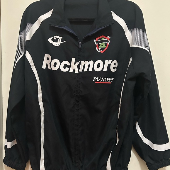 Stylish black and white jacket with Rockmore branding. Features a zip-up front and sporty design. Lightweight windbreaker.