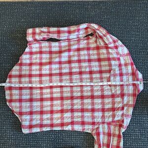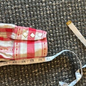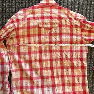 Original Rock Mount western shirt made in Denver Colo red and light grey stripes with white pearl buttons. Great condition no size so please look at measurements. I would guess a large.