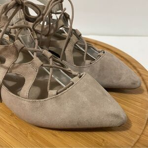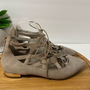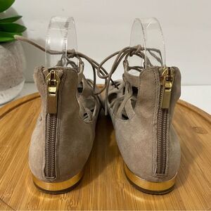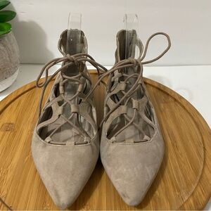 Great pre-owned condition. Minimal wear, no rips, no tears. Grey suede, crossover straps, gladiator style oxford, lace-up, low heel. No box. See all photos for condition/wear.