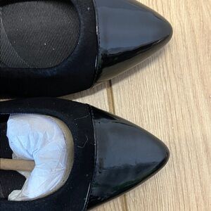 Elegant black loafers with a glossy patent toe. Ideal for both casual and formal settings. Comfortable fit.