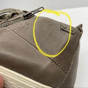 Rockport Cobb Hill Willa Mid Top Leather Sneakers. In a grayish/brownish color. There is some scuffing to the toe line, some dark spots throughout and some wear to the sole/outer soles. Super soft leather. Lace up closure along with a zipper closure for easy on and off. US size 6.