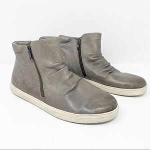 Super classic, and easy to wear. Streetwear style, round toe, all leather zip up sneakers. Size 9, gently preowned, showing light signs of wear such as scuffs and wear. needs a little TLC but still tons of life left.