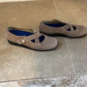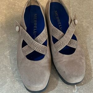 Rockport suede Mary Jane’s in size 9W. These have Merrell cushioned insoles. Slip on style. Some wear showing on the toes and a couple of tiny spots as seen in the pictures.
