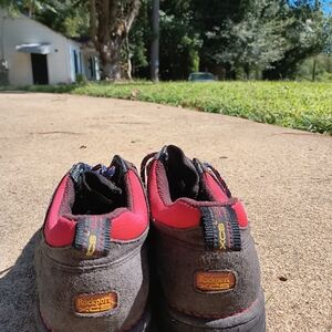 Stylish and rugged athletic shoes. Red and black design. Ideal for active wear.