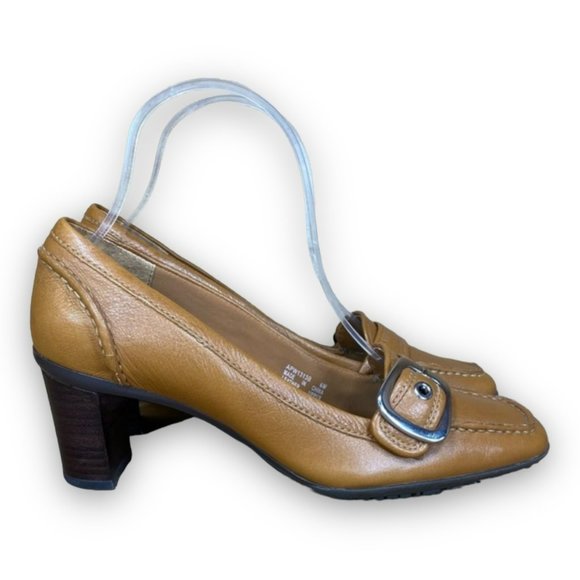 Rockport Square Toe Buckle Heels APW1313B Leather Slip On Tan RARE Women 6M