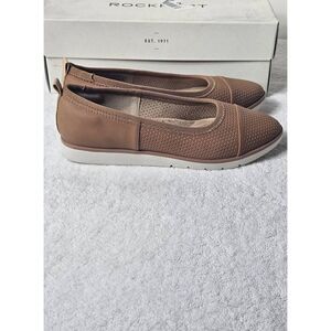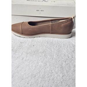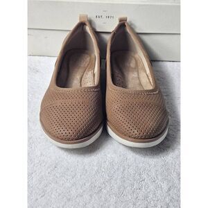 Tan, size 6.5. Beautiful and very comfortable! Perforated suede uppers, comfort insoles, synthetic rubber soles. Wear with anything!