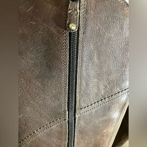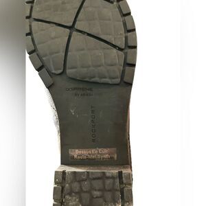 Rockport brown, tall boots. Weatherproof. Side zip. Back elastic. Minor scuffing that probably could be fixed with a little shoe polish.