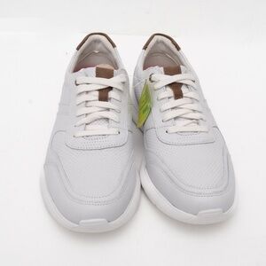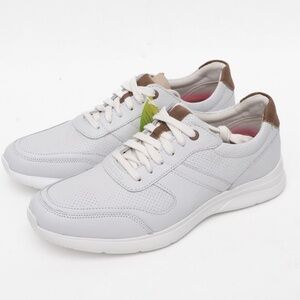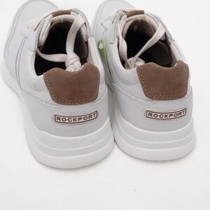 Rockport Total Motion Active Mudguard sneakers in white leather, accented with brown details at the tongue and heel for a versatile look. Designed with perforated panels for breathability and a cushioned sole for comfort, this lace-up style offers a wide fit (E/W) and lightweight support.