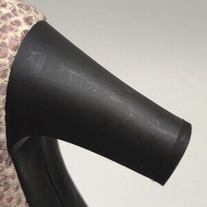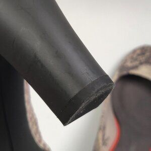 Cleaning out my closet, I haven't worn these in a long time but they're still in great condition. Signs of wear include light wrinkling near the ball of the feet (not very visible due to the embossed print) and marks on the heel from regular wear--mainly surface "scuffs" that are only visible when the light hits it in the right way as photographed. The right heel does have one almost horizontal white mark as pictured (measures approx 6mm), might be able to be cleaned off but I have not tried. Heel height measures just under 3" (75mm). Does not come with box.