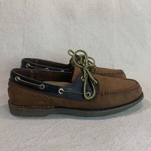 Previously worn; hand-sewn construction; full-grain nubuck leather uppers; 2 eyelets with leather cord laces; padded collars and tongue for extra comfort; cushioned insoles with breathable polyurethane; rubber outsoles; unlined upper construction allows for greater breathability, so you can wear these shoes barefoot. Shoes are in excellent condition; uppers and soles are in great shape with lots of wear left. #rockport #bootandshoetraders