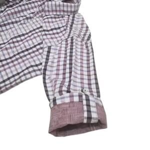 This unique shirt features a stylish plaid/check pattern, snap & button closures, and contrast details. The roll-tab sleeves add versatility.