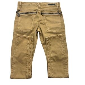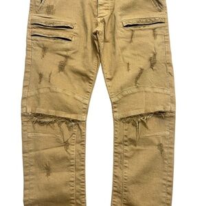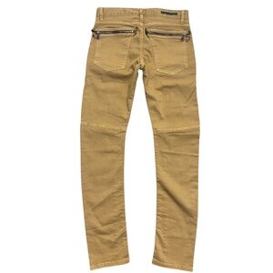 Item: Mens jeans in a khaki/brown color with moto/biker styling