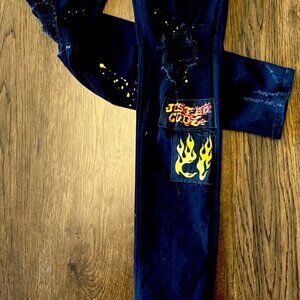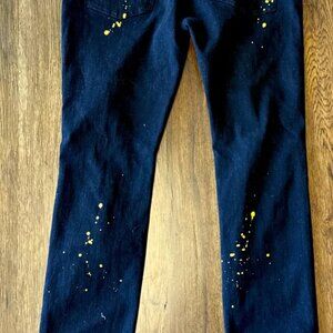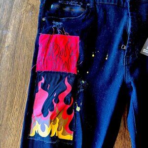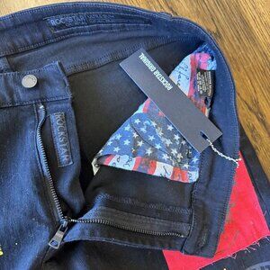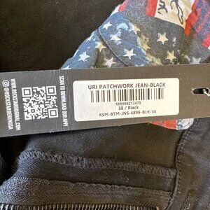 Brand new with tags…These Rockstar Original jeans are in black with a 38 waist and 32 inseam. They feature a slim fit in a skinny style, made of denim with stretch for comfort. The design includes a grunge metal theme with patchwork accents, perfect for a bold and edgy look. The closure is zippered, and the jeans have a 5-pocket design with a logo accent.