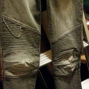Size 26 Black moto jeans with silver tone hardware, 5 pockets , one with zipper