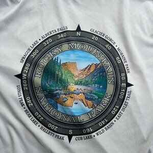 This great shirt has some of the best places in RMNP listed around a compass on the back. The image is the Key Hole on Long's Peak. This is a great gift for a hiking lover. The wicking fabric will keep them comfortable. It is on the American Backcountry tag.