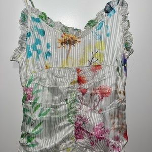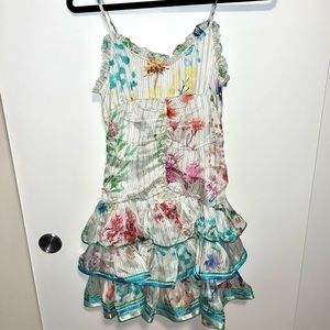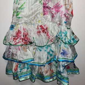 Rococo Sand anais ruffle mini dress. Sleeveless. White with rainbow floral print. New with tags. Size small. Adjustable straps. Ruching on the chest.