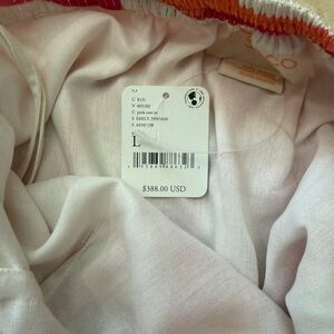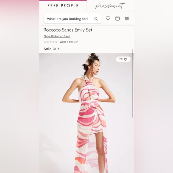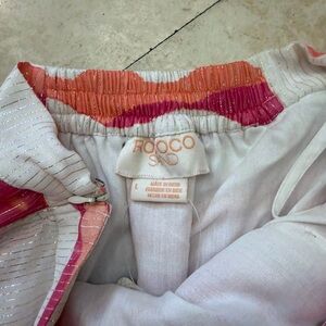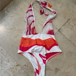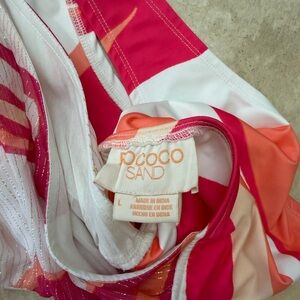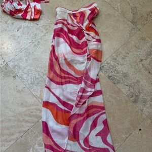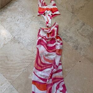 Two-piece swim set with bold swirl print. Bright pink and orange panels. Matching top and cover-up style skirt. Playful summer vibe.