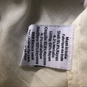 Details: • Color/pattern: pink, purple, gold • Design details: metallic striping, V-neck, smocked elastic cuff ruffle trim and tiered skirt • Button front • structured shoulder