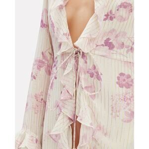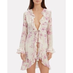 Rococo Sand Lilac Floral Mini Cover-Up Dress in Purple. Size Petite = XS / Extra Small. Features plunge V-neck, long sleeve, ruffle details, tassel drawstring waist, gold metallic stripes, floral print, high-low hem, and mini length. Style RS-IRISH-1262-EXCL. 100% Viscose. Excellent condition, no flaws.